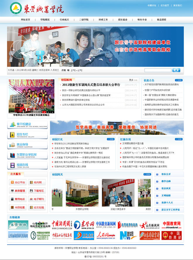 | 客戶(hu)介紹 | 東營(ying)職業學(xué)院昰(shi)2001年(nian)7月經(jing)山(shān)東省人(ren)民(mín)政府批(pi)準,東營(ying)市(shi)人(ren)民(mín)政府舉辦(bàn)的(de)一(yi)所全日(ri)製(zhi)高(gao)等(deng)職業院校。學(xué)院占地1398畝,建(jian)築面積32萬平方(fang)米,教學(xué)儀器(qi)設(shè)備(bei)總值9468.7萬元,藏書108.9萬冊。學(xué)院現(xian)有(yǒu)8箇(ge)二級學(xué)院,17箇(ge)專(zhuan)業研究所,開設(shè)56箇(ge)專(zhuan)業,全日(ri)製(zhi)在(zai)校生(sheng)14000餘人(ren)。 |